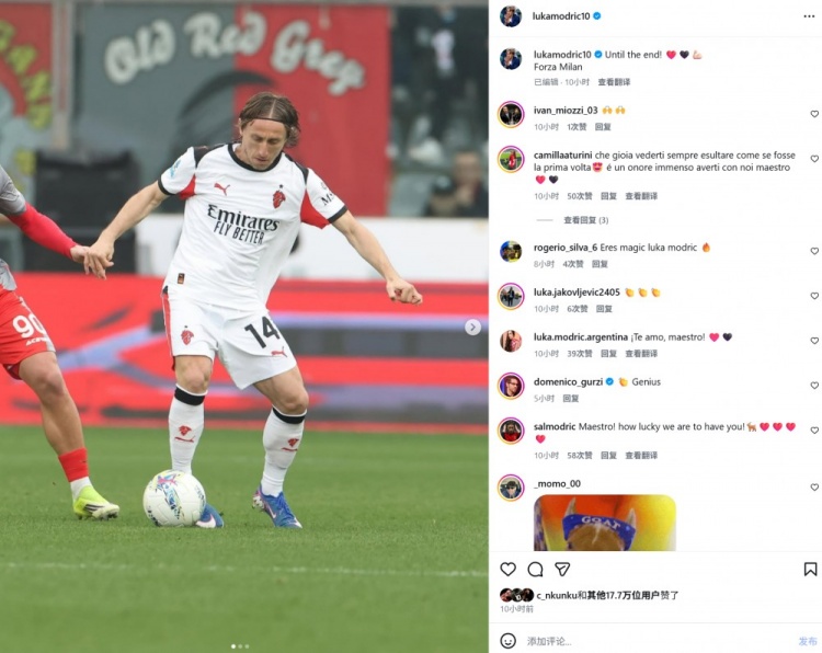 本场比赛40岁莫德里奇再次打满全场,赛后他也在个人社媒晒照,配文写道:“我们坚持到最后一刻!加油米兰!”